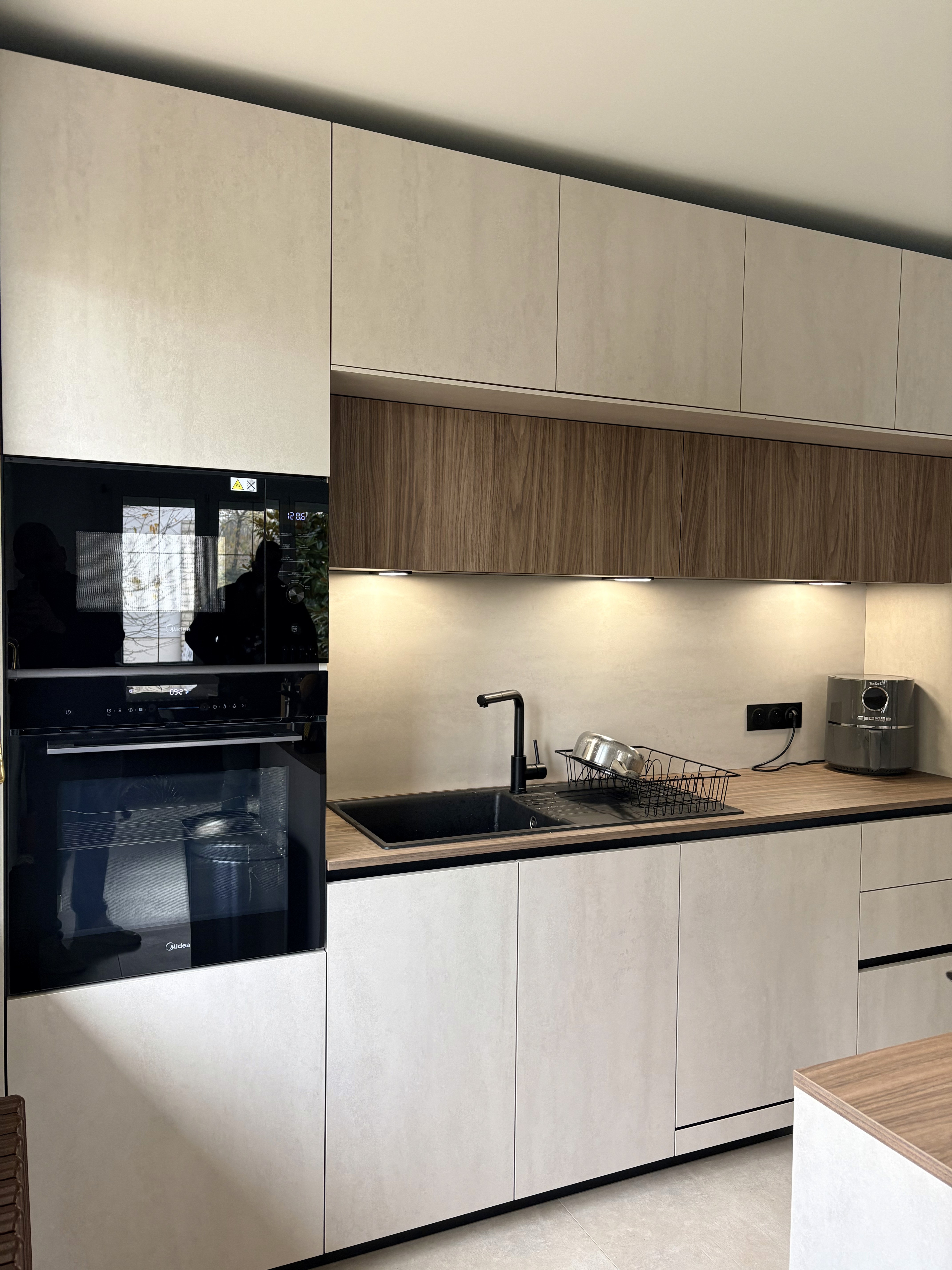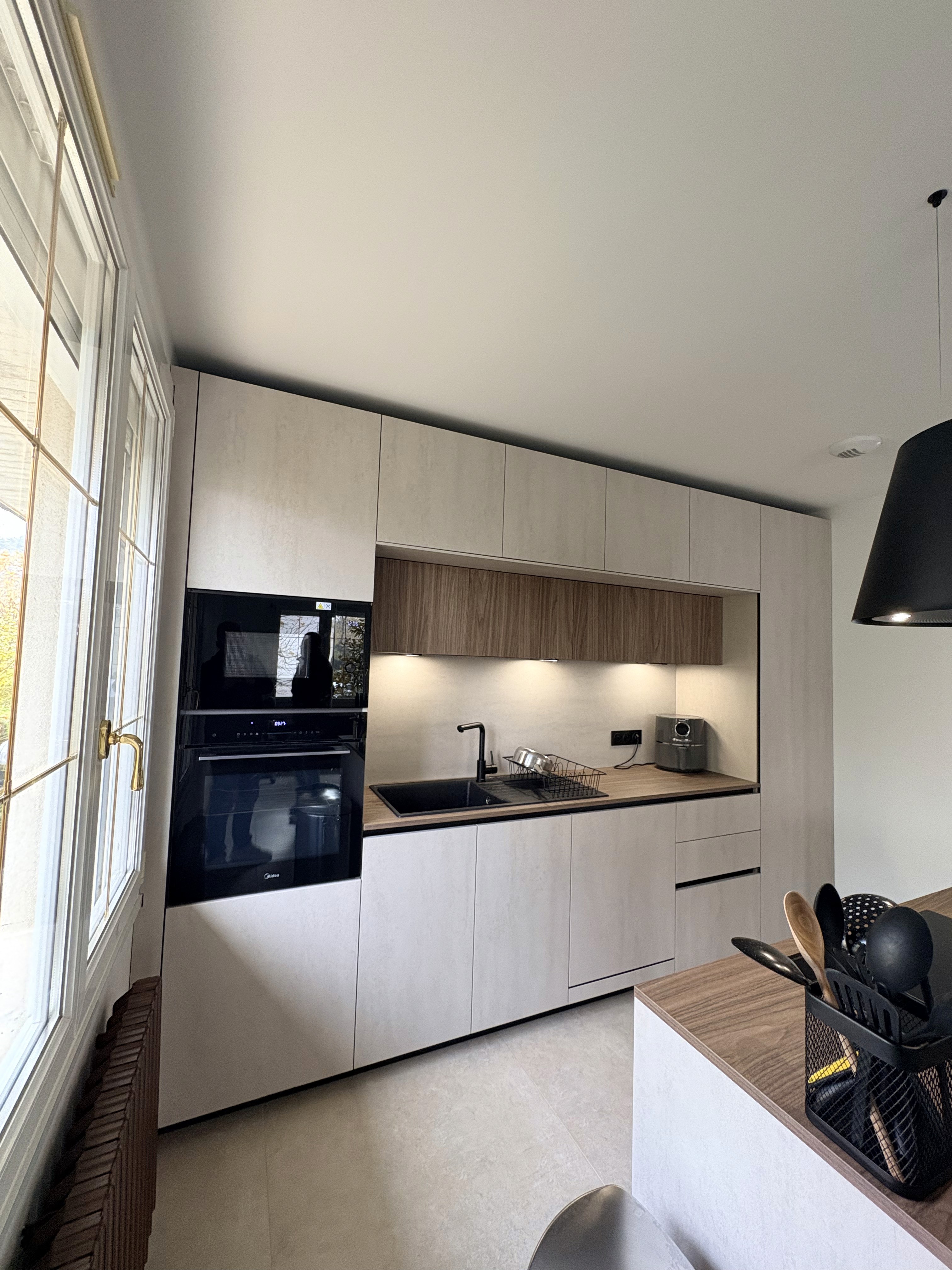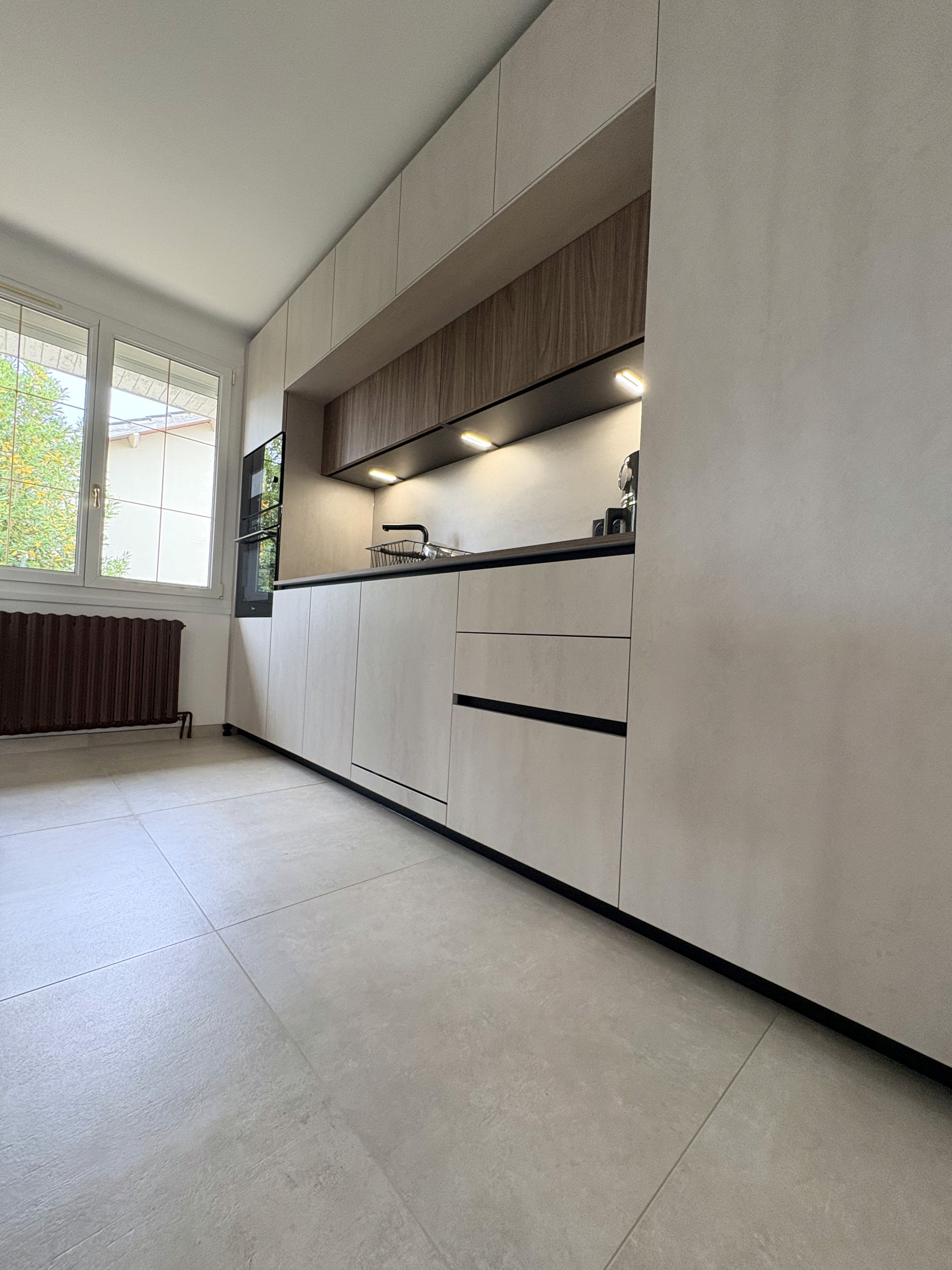 Cette cuisine contemporaine associe des façades minérales claires avec une niche centrale en décor bois, apportant chaleur et contraste à l’ensemble. L’éclairage LED intégré sous les meubles hauts met en valeur le plan de travail et améliore le confort d’utilisation au quotidien.
