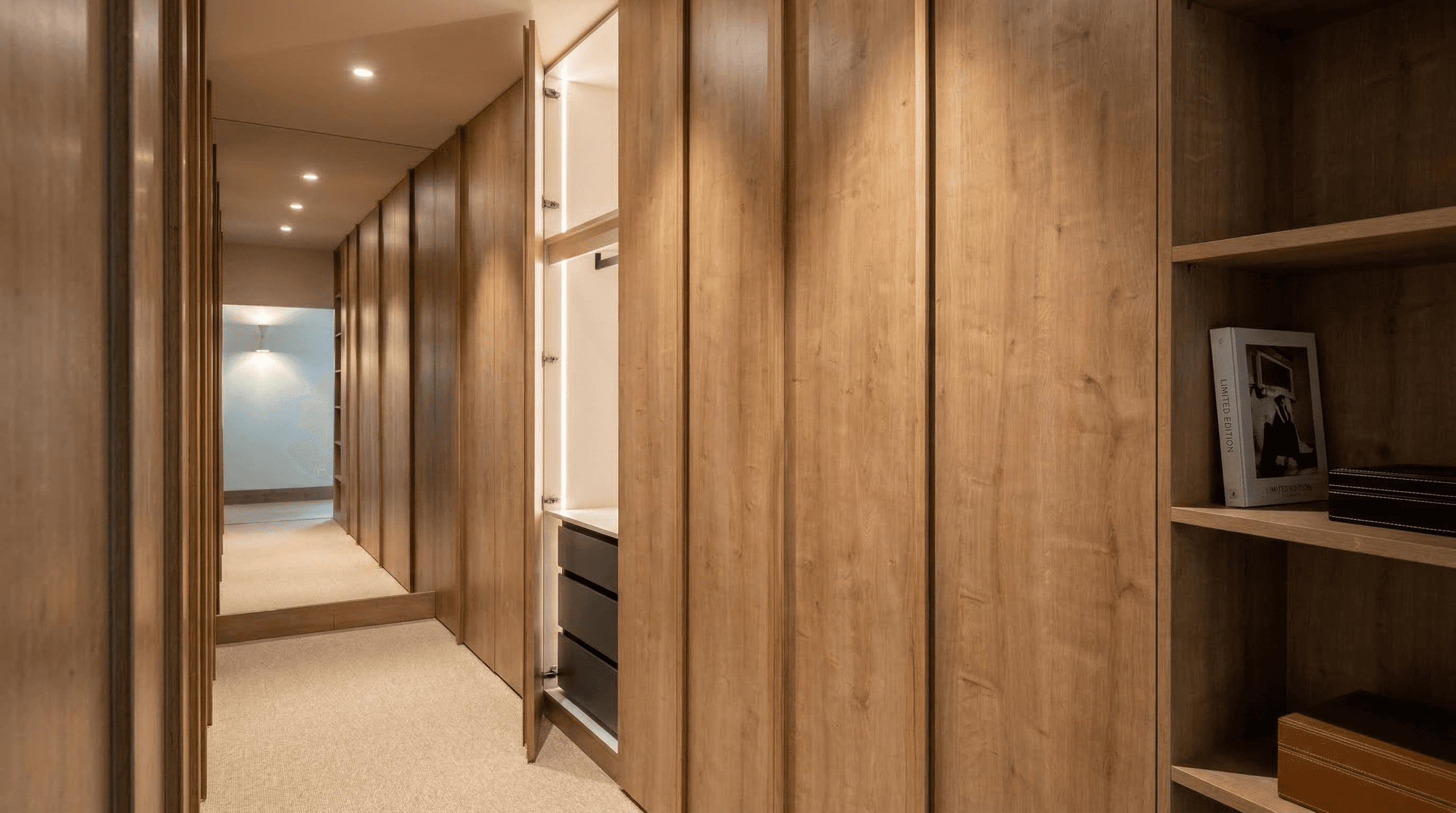Ce dressing a été entièrement fabriqué dans notre atelier, garantissant une qualité de finition et un ajustement parfait de l’espace.