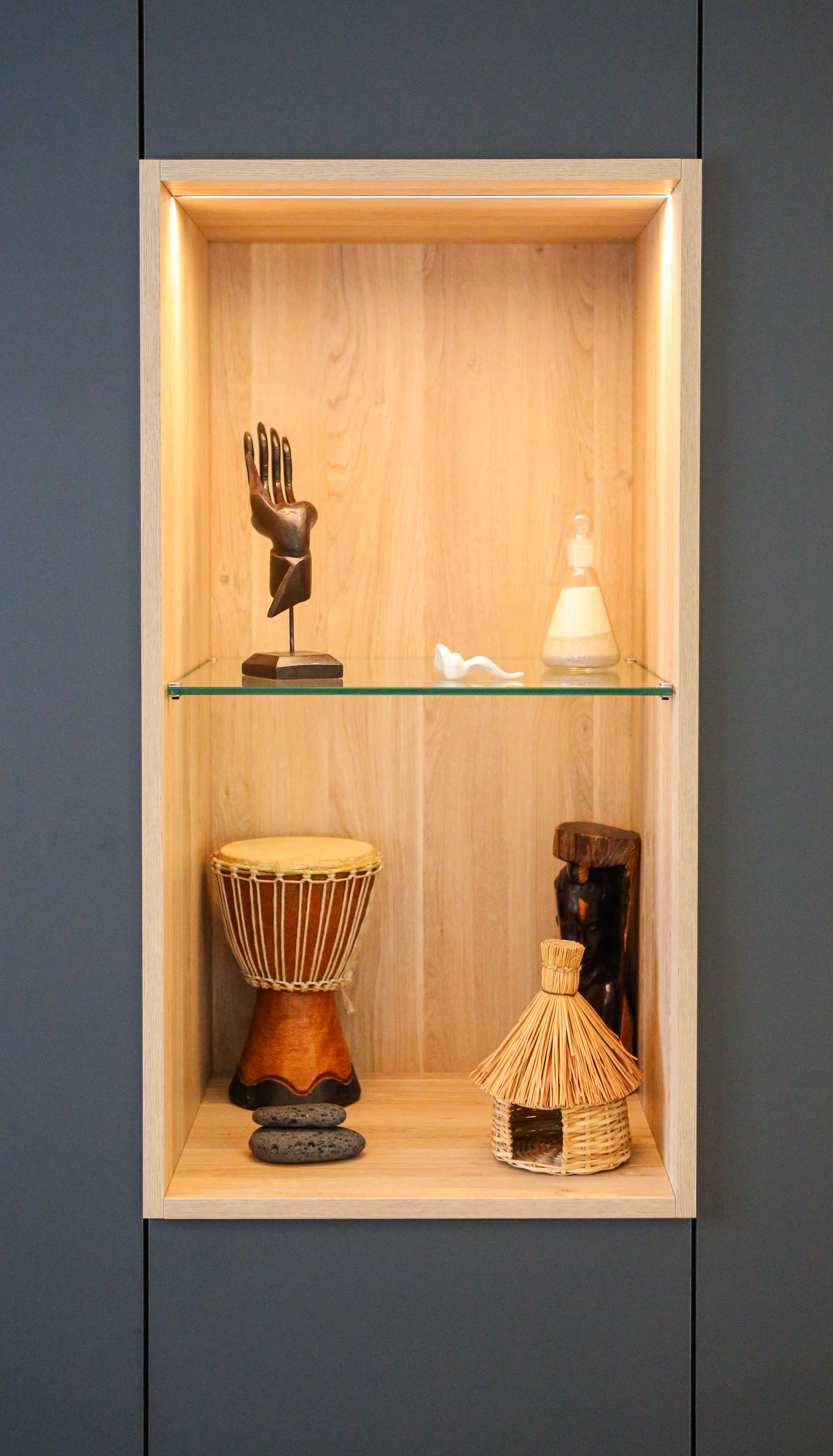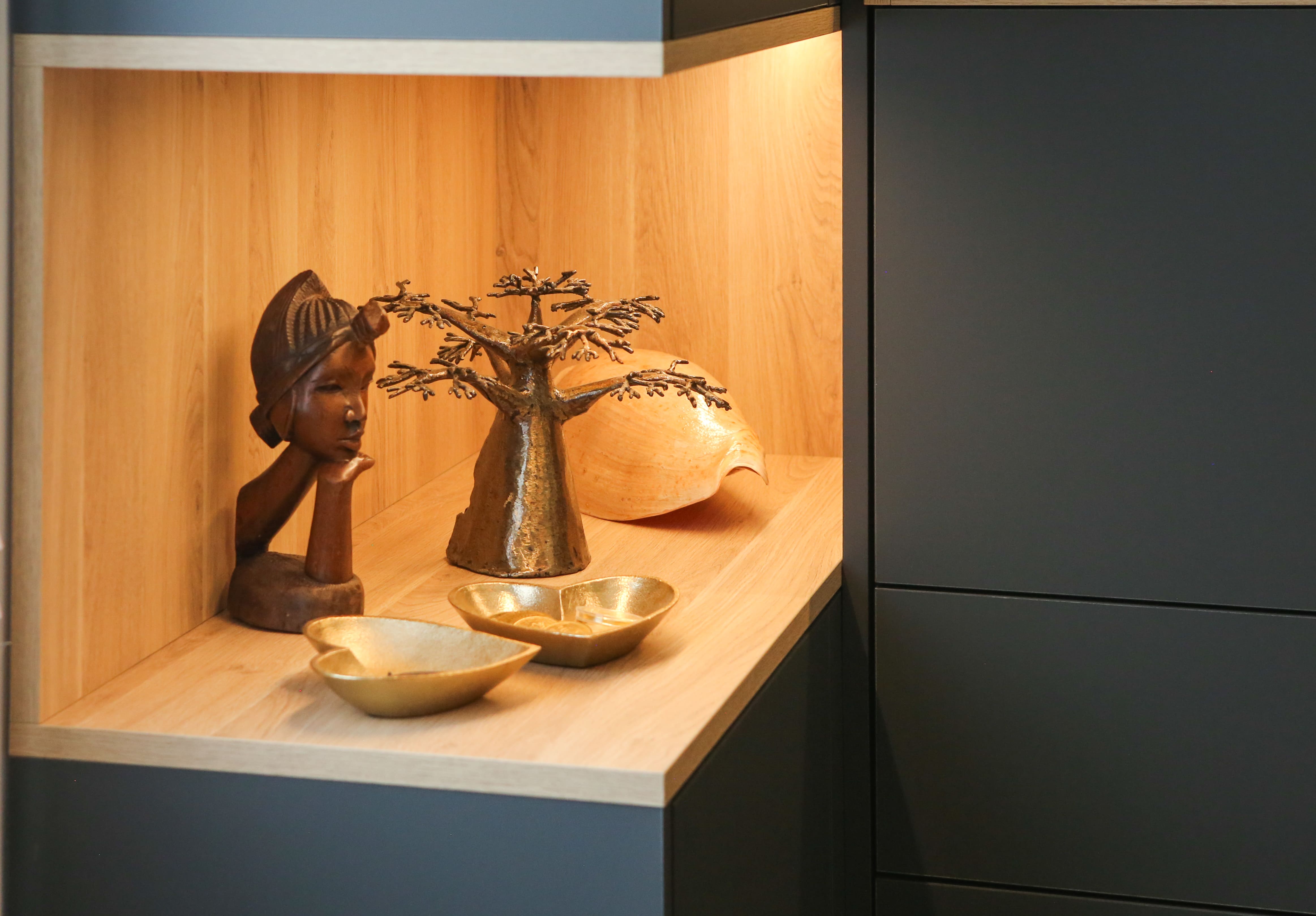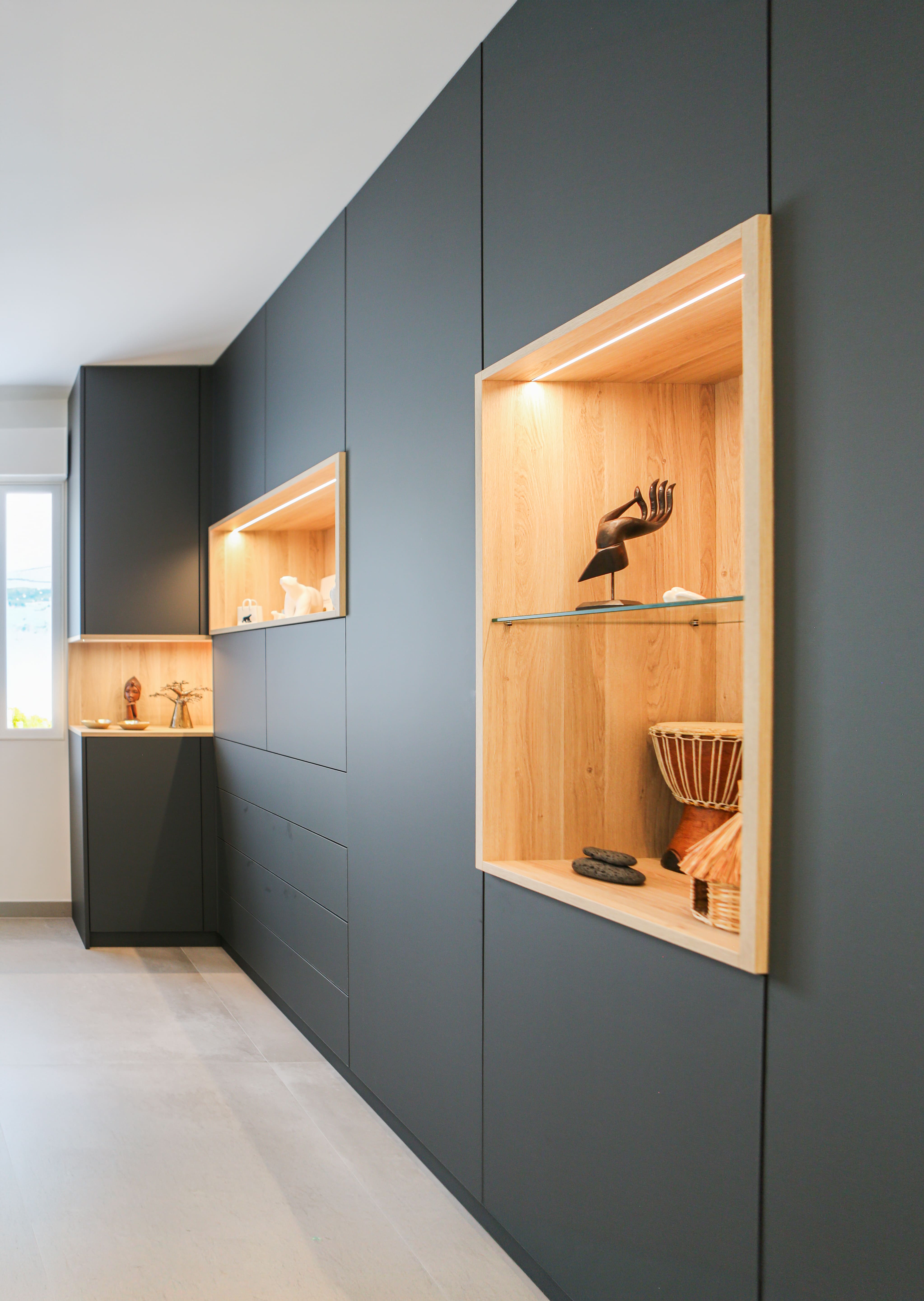 Création d’un meuble d’entrée entièrement conçu dans notre atelier, avec finition anti-traces de doigts. posé par notre équipe